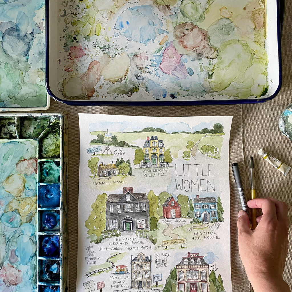 In my quiet studio in Nashville I create captivating watercolors of classic literature and real-world locations just for you!