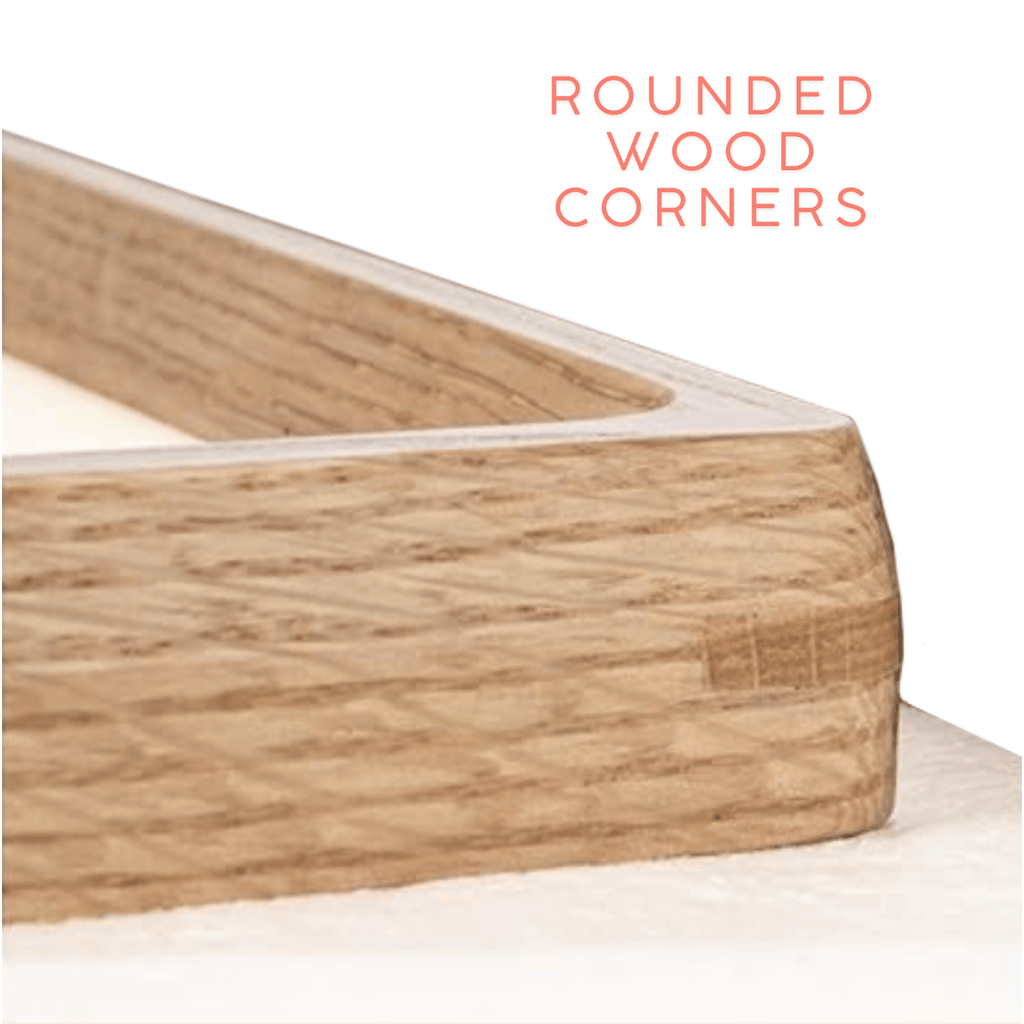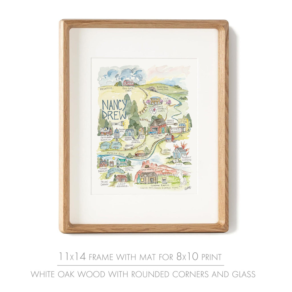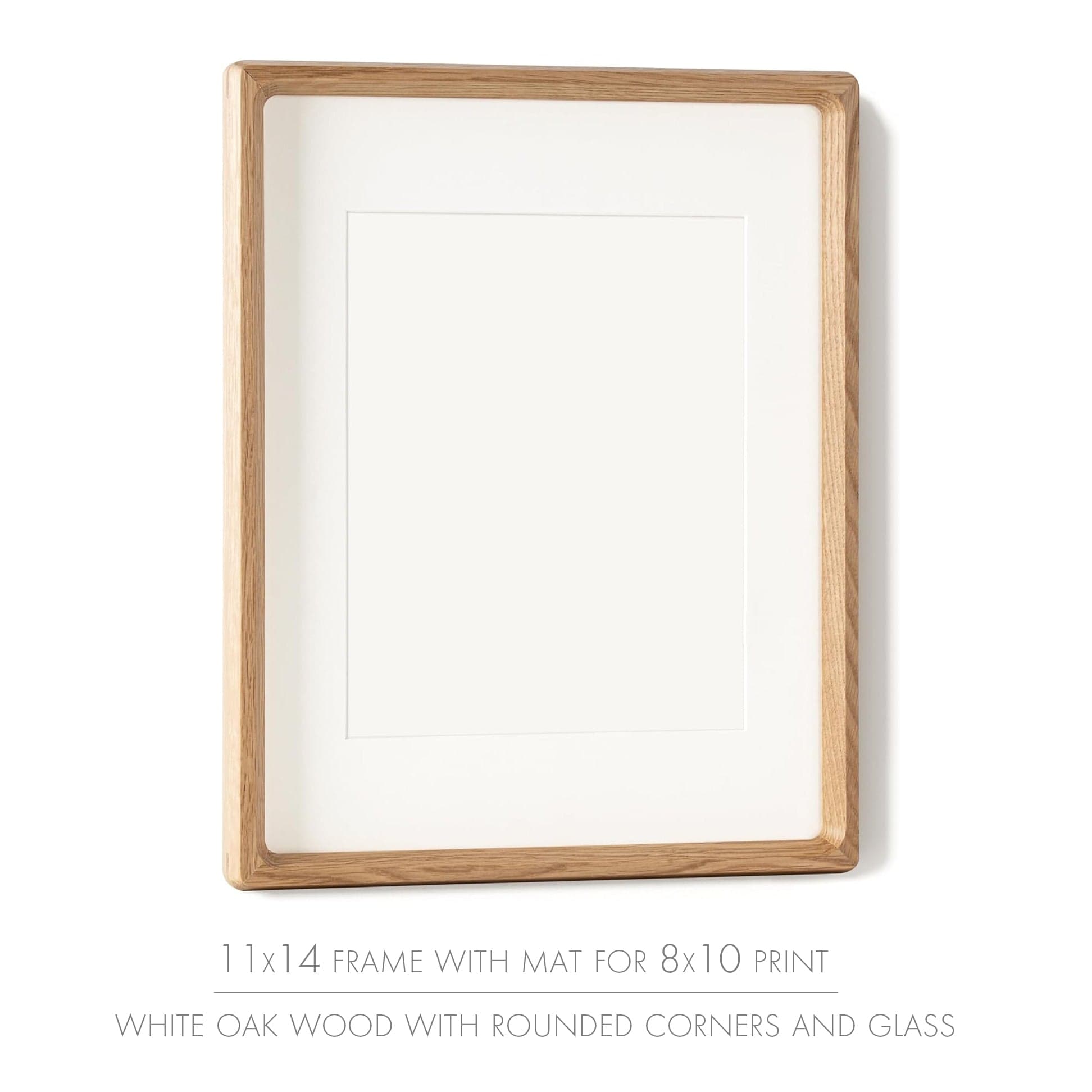 Each frame is 11x14 white oak wood with glass. The 11x14 fits in the frame perfectly. If choosing an 8x10 it will be placed in a white mat within the 11x14 frame.