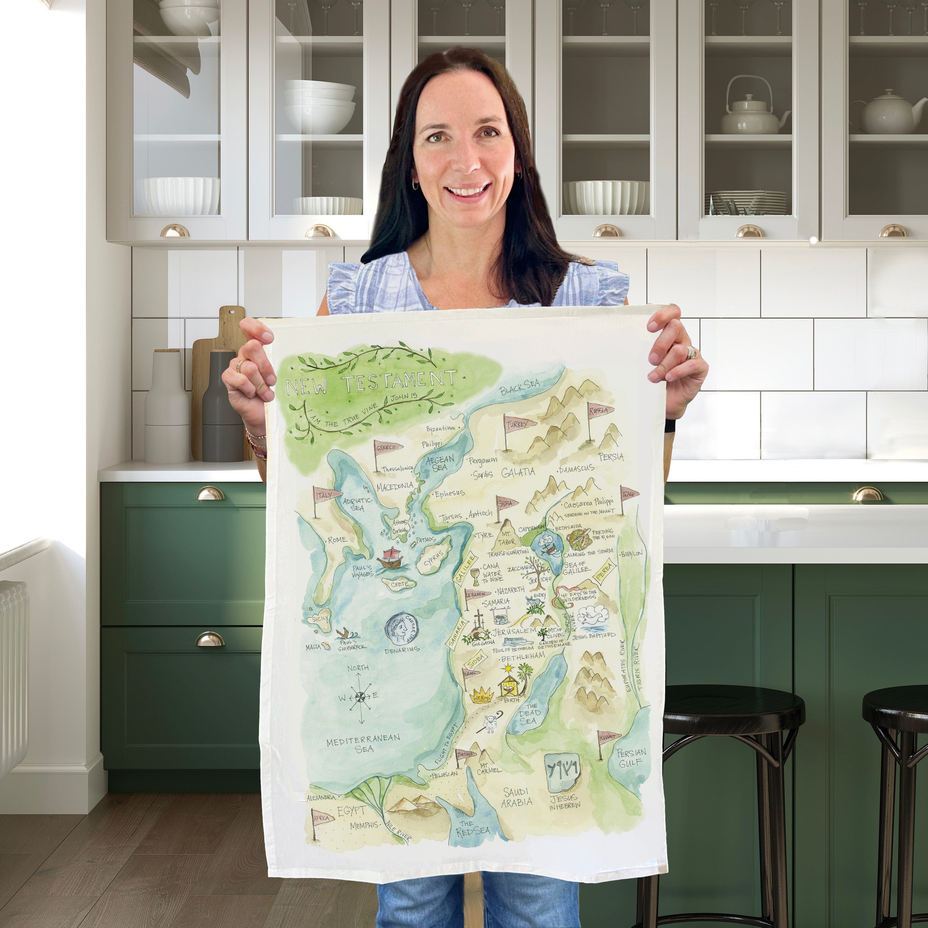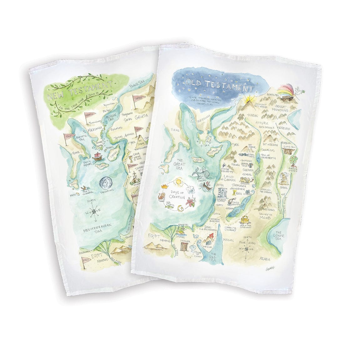 My original Bible Map watercolors available in full size, charming flour sack tea towels. A set of two, one Old Testament and one New Testament, bundled together. A great gift! Designed in Nashville, TN. Made in India.