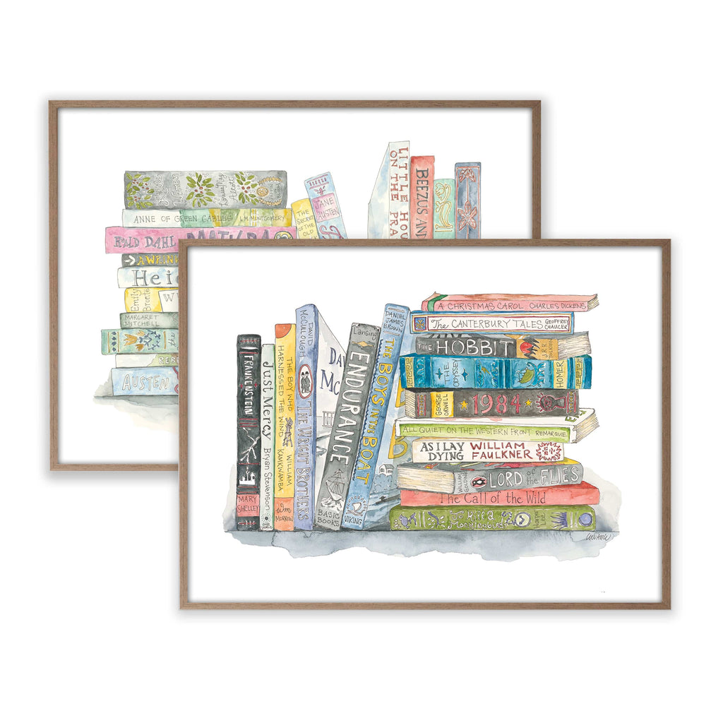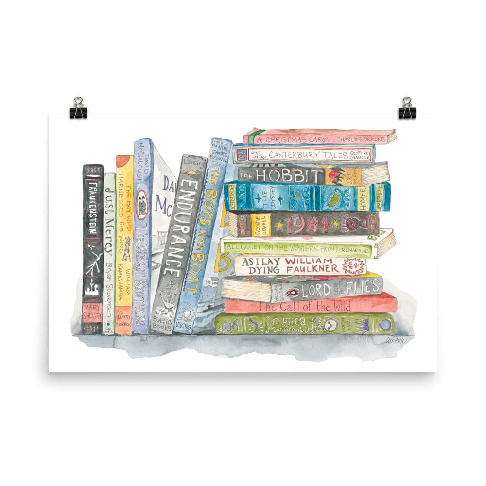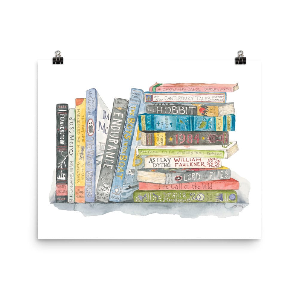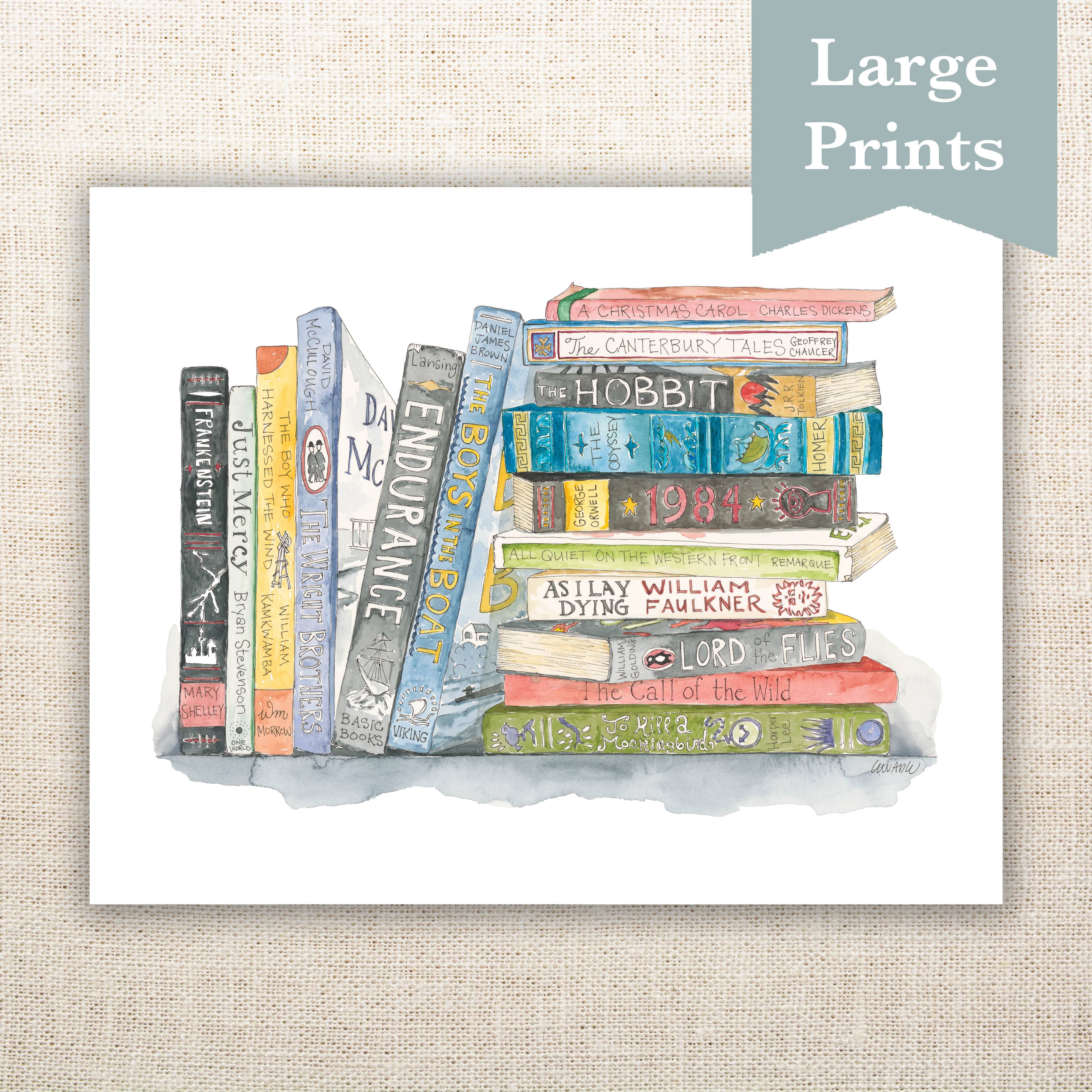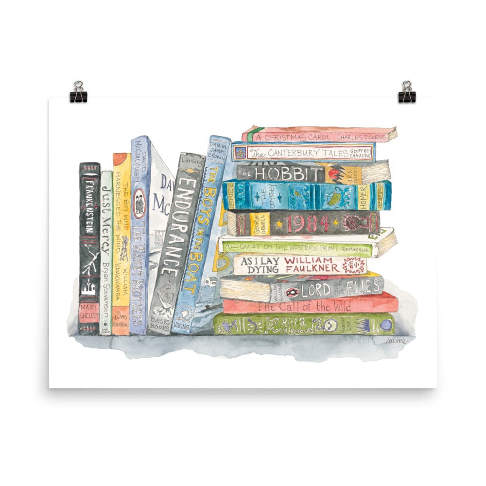 A stack of a selection of our favorite books! Including these loved titles: Frankenstein, Endurance, The Hobbit, Lord of the Flies, As I Lay Dying, To Kill a Mockingbird, The Call of the Wild, The Boys in the Boat, The Wright Brothers, The Odyssey, The Canterbury Tales, A Christmas Carol, Just Mercy, The Boy Who Harnessed the Wind and 1984.