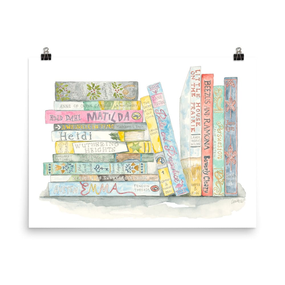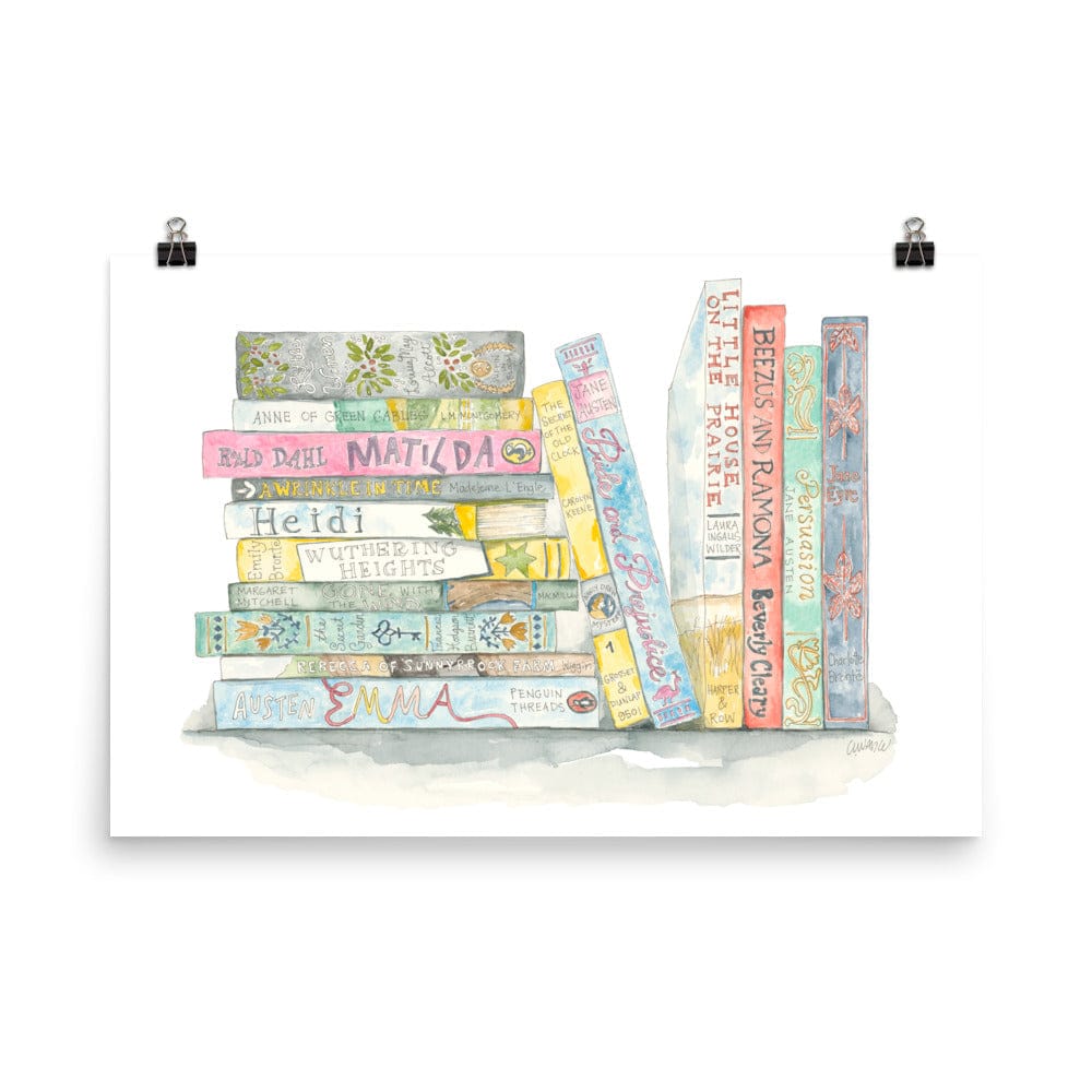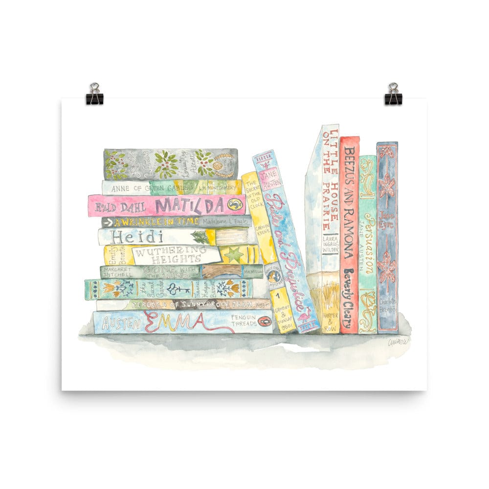 A stack of a selection of our favorite books! I've included: Emma, Pride and Prejudice, Nancy Drew, Matilda, Anne of Green Gables, Little Women, Heidi, Gone with the Wind, Rebecca of Sunnybrook Farm, Wuthering Heights, Persuasion, Little House on the Prairie, Beezus and Ramona, and Jane Eyre.