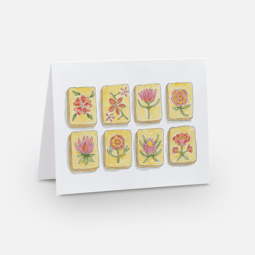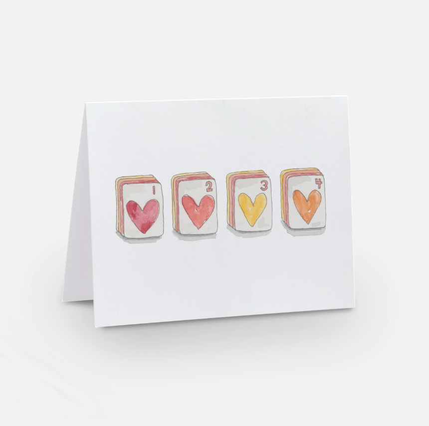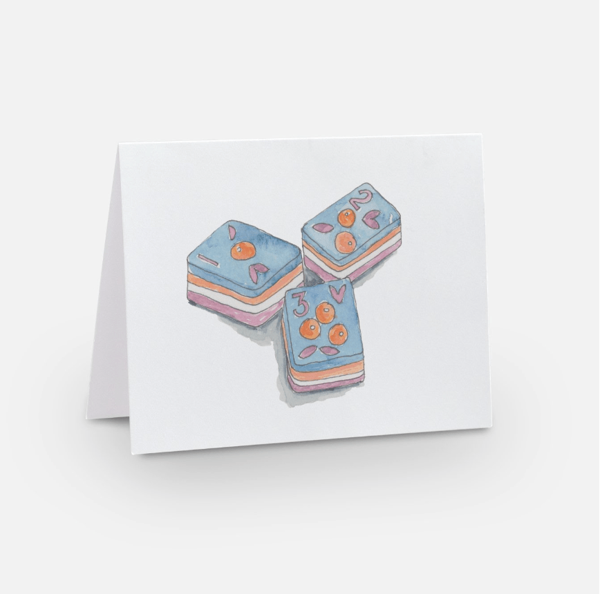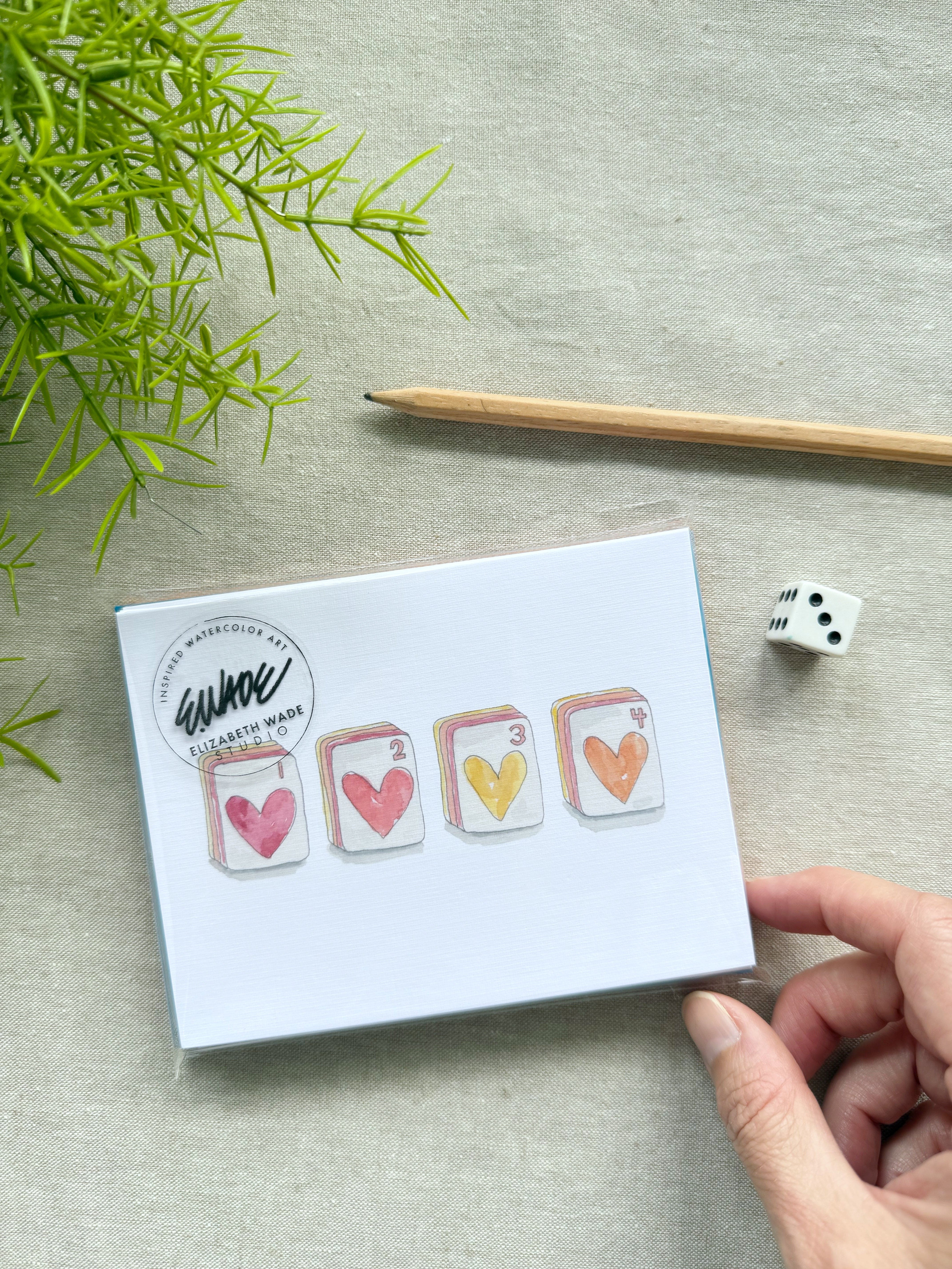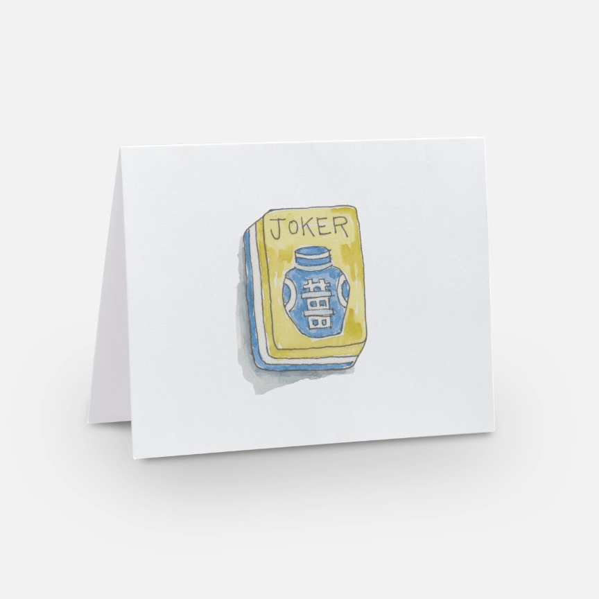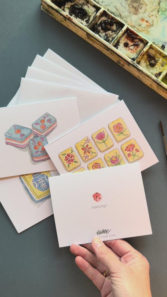 Celebrate friends and mahjong players with this fun notecard set of watercolor game tiles. A different color dice is on the back of each card.