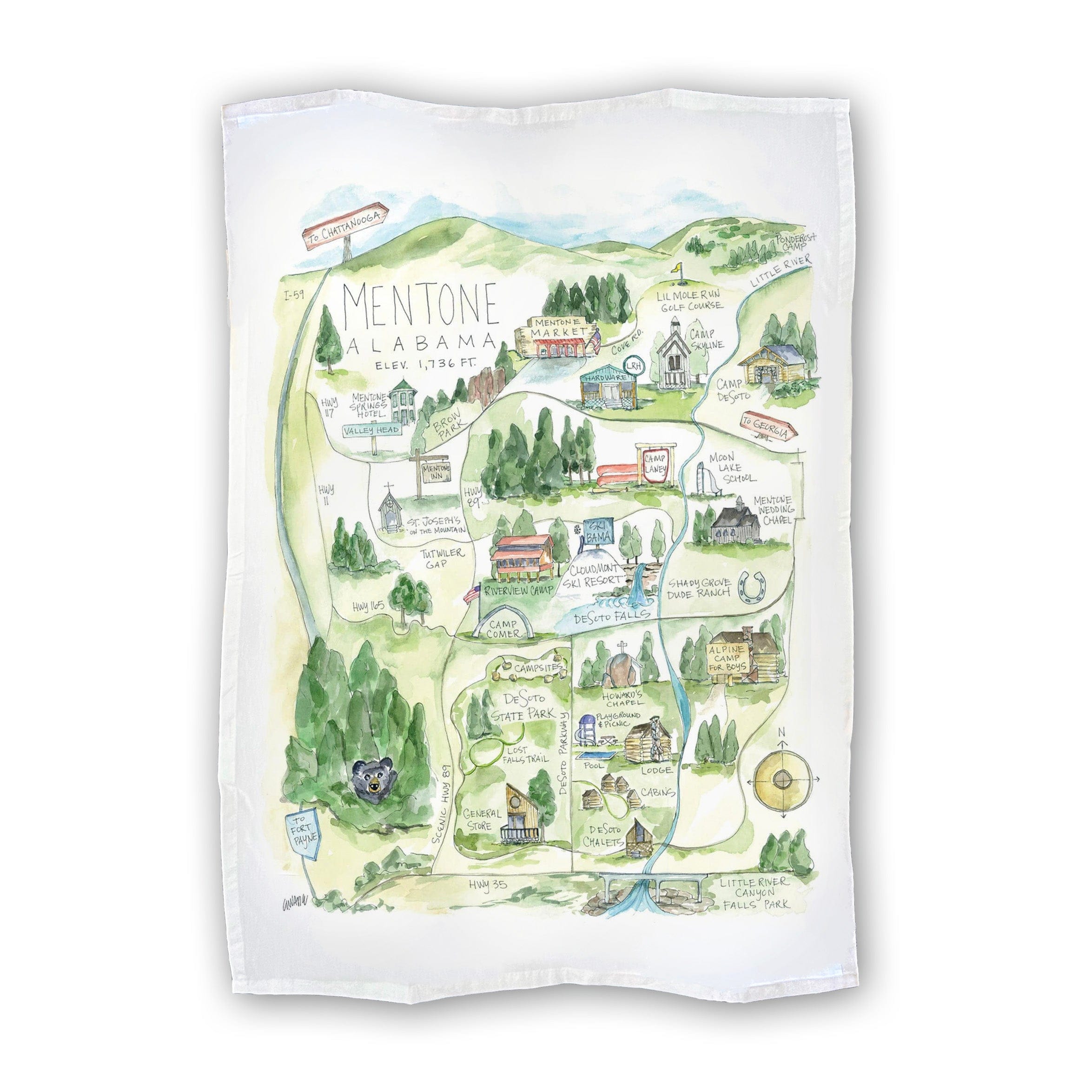 My original illustration of Mentone, Alabama. Hours of research and collaboration guided my drawing and watercolor landmarks. Landmarks include: DeSoto Falls, Little River Canyon, Camp Alpine, Camp Laney, Riverview Camp, Camp DeSoto, Camp Pondersosa, Shady Grove Dude Ranch and more!
