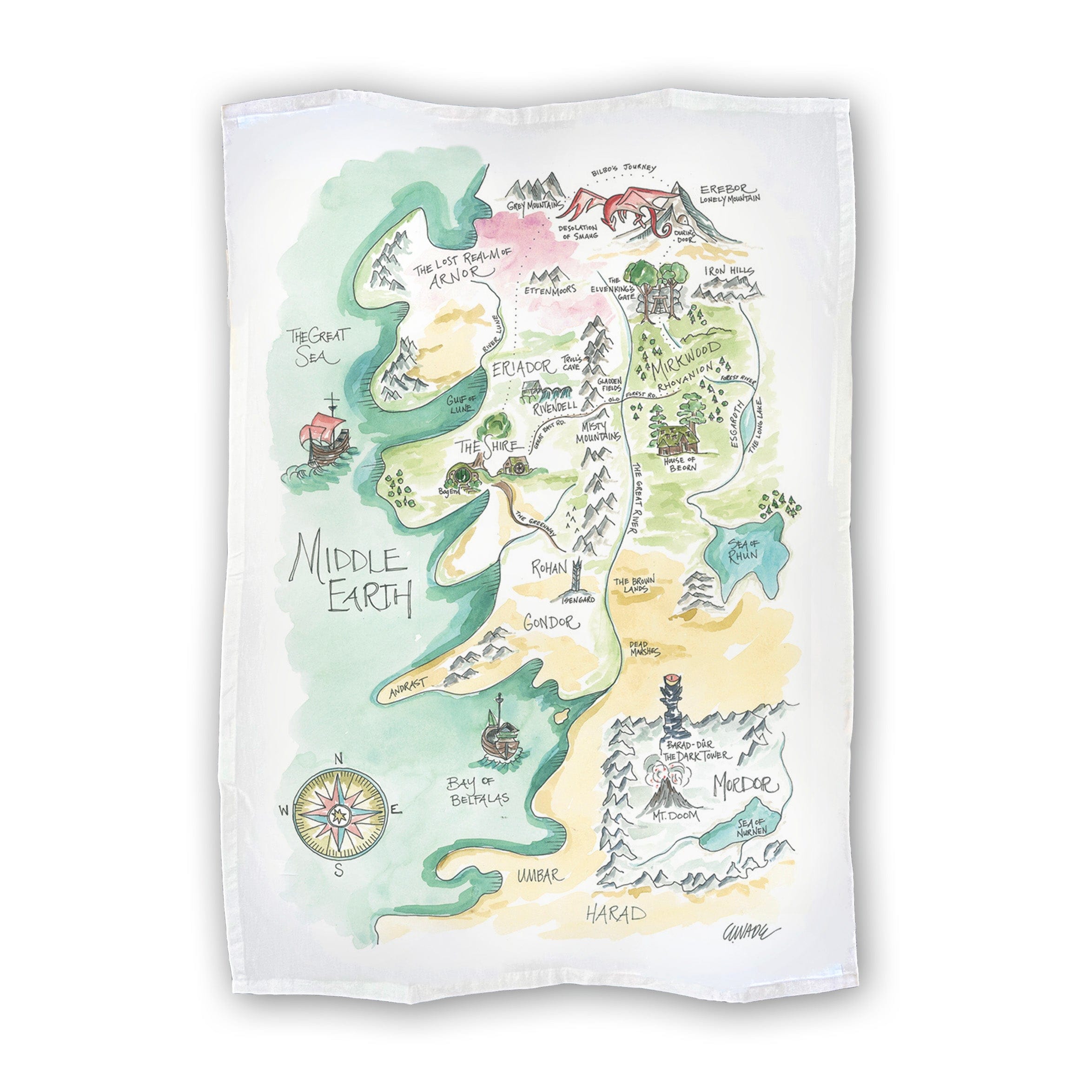 Calling all Middle-Earth enthusiasts and kitchen wizards! 🌟 Dive into this enchanting world with our watercolor tea towel, featuring a whimsical painting of the legendary land of Middle-Earth. Imagine Sauron's eye peeking from your oven, or Frodo and Sam’s journey across your countertop!