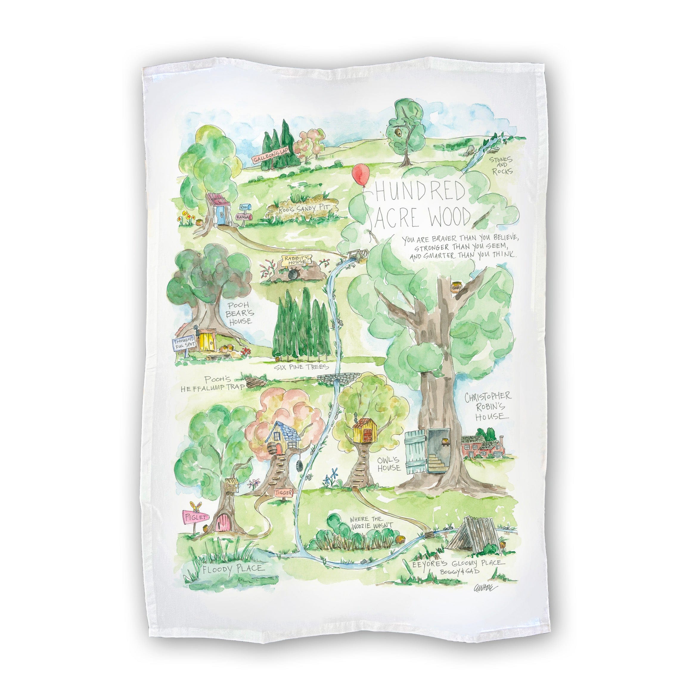 Step into a world of childhood wonder with our "Hundred Acre Wood" watercolor tea towel painting featuring Winnie the Pooh and friends' landmarks! This delightful piece brings enchanting charm and a splash of nostalgia to your kitchen or bath.