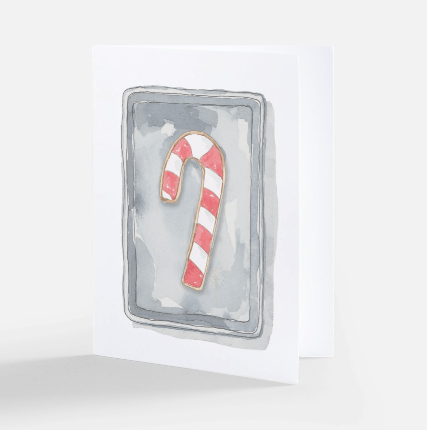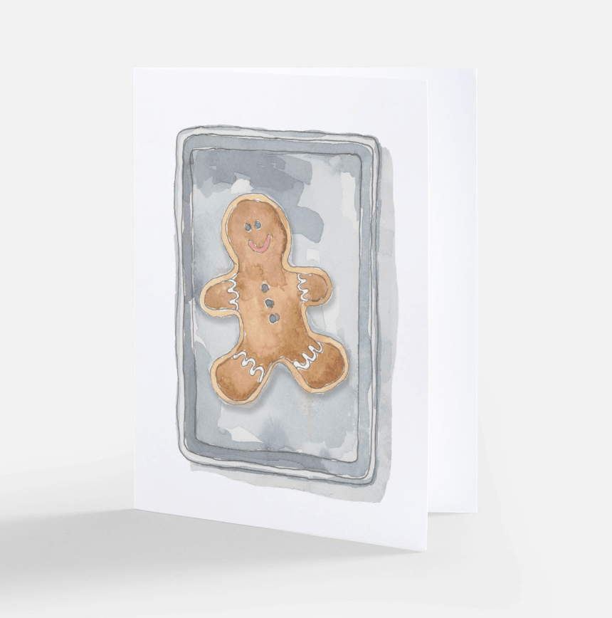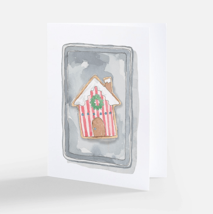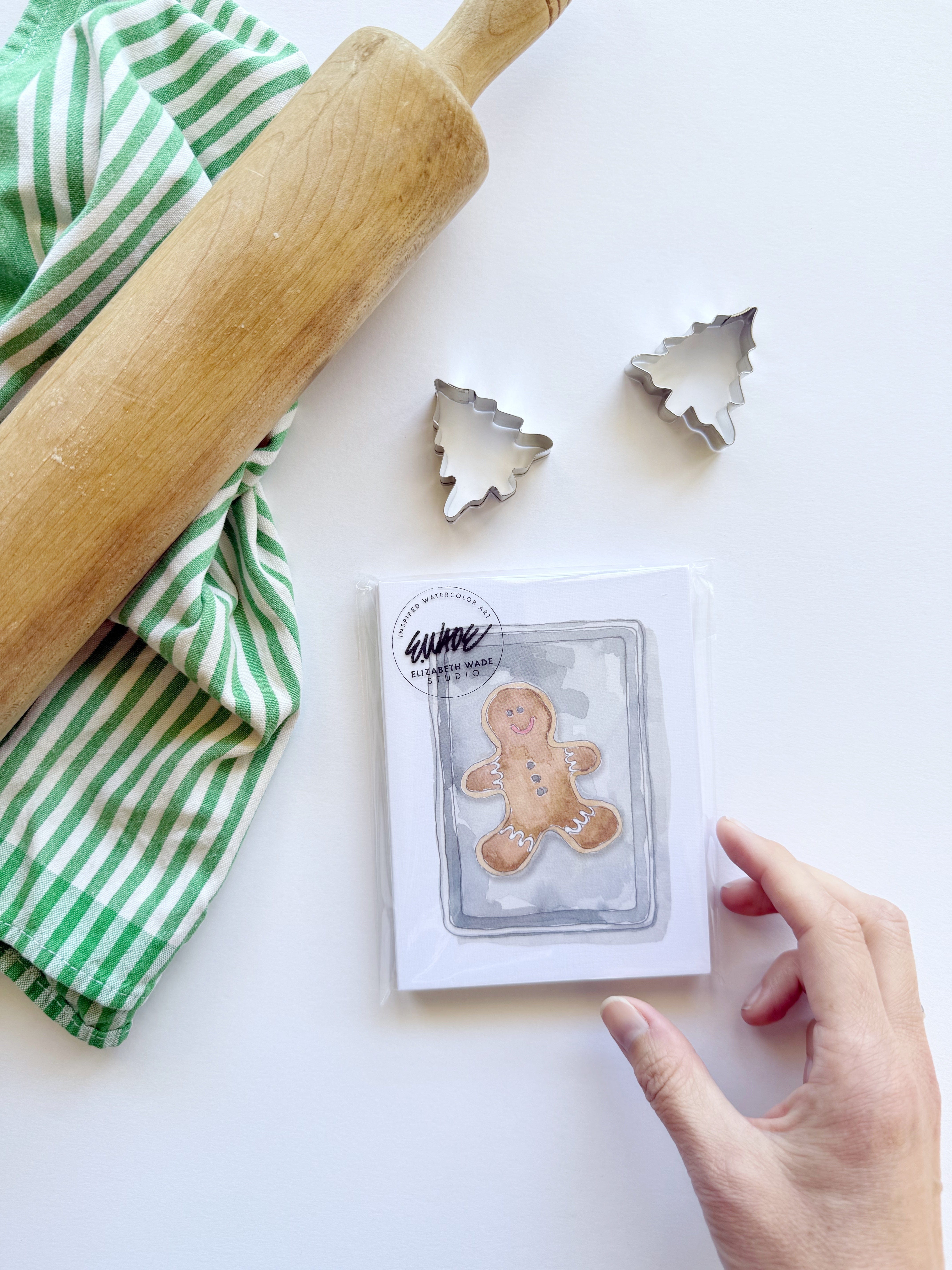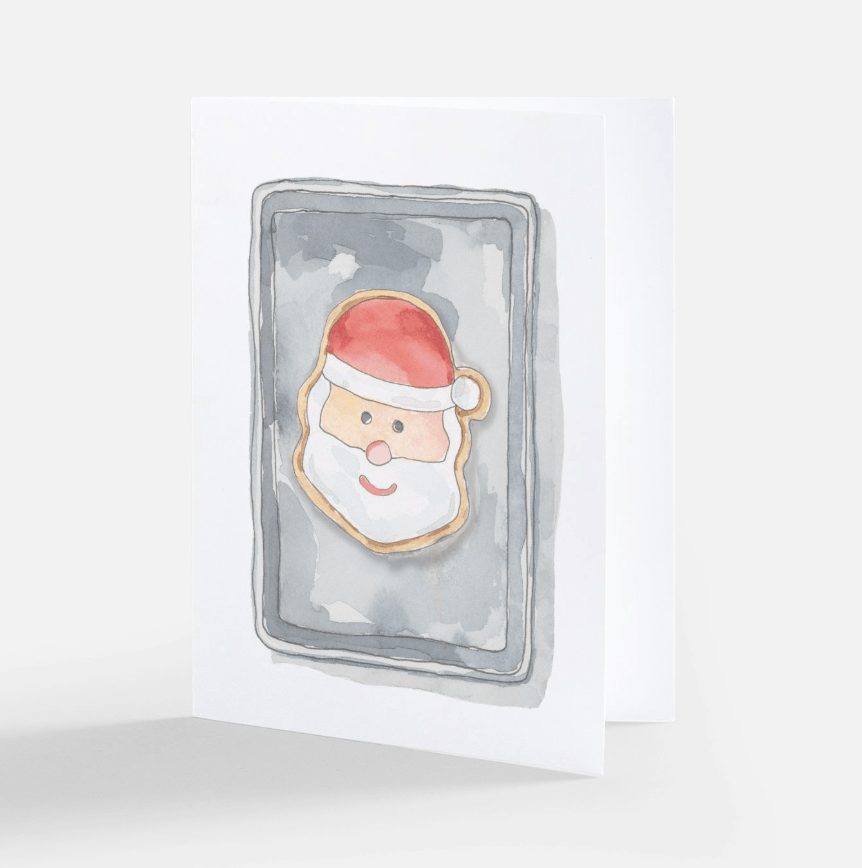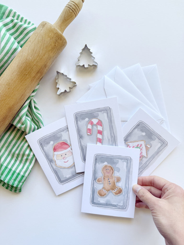 Celebrate the holidays with this fun and coloful notecard set of watercolor sugar cookies fresh out of the oven on a cookie sheet. A watercolor rolling pin is on the back of each card.