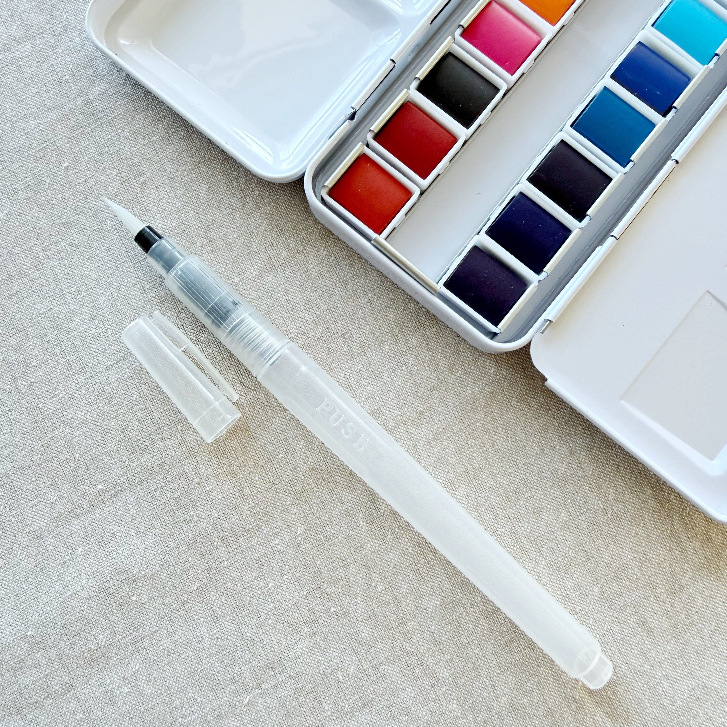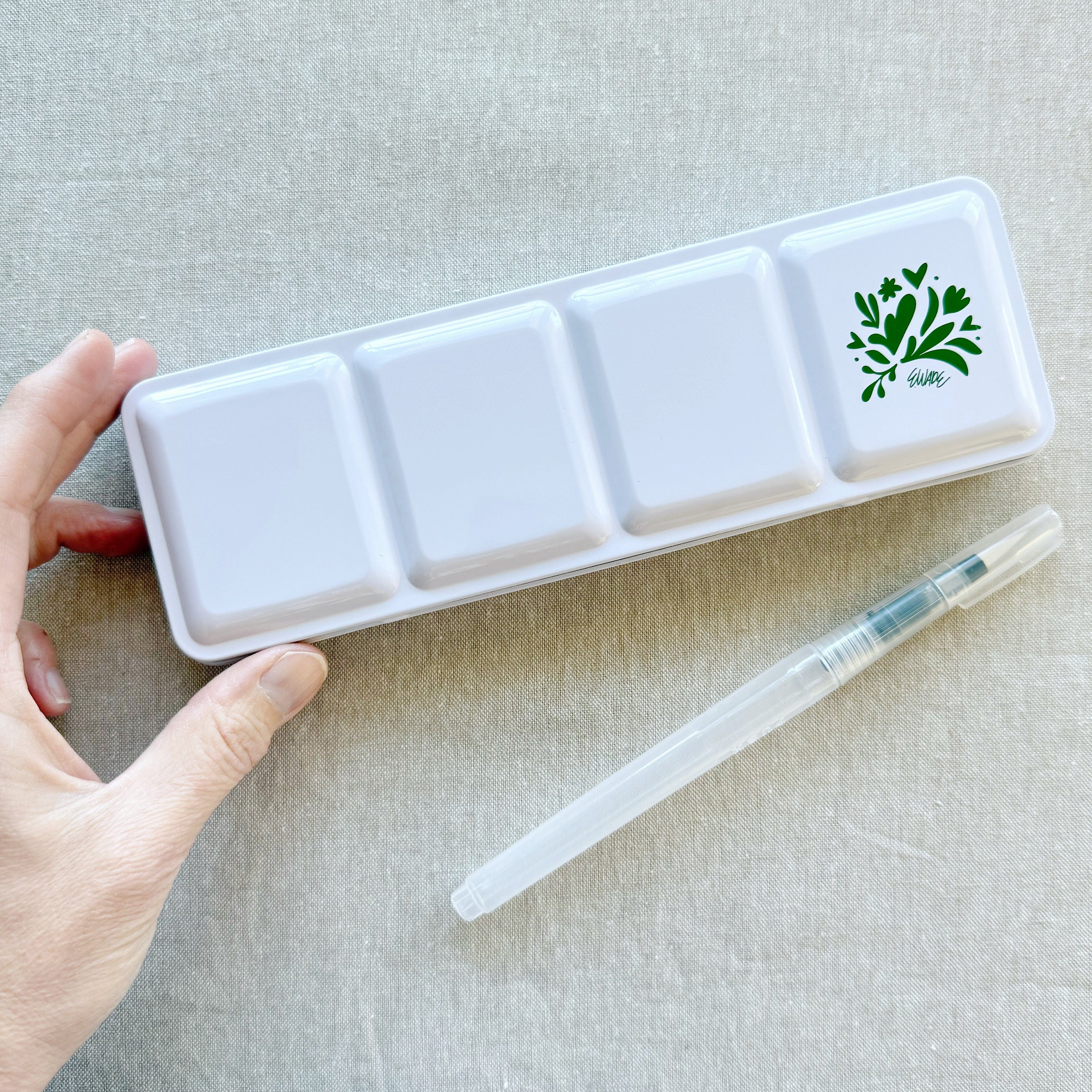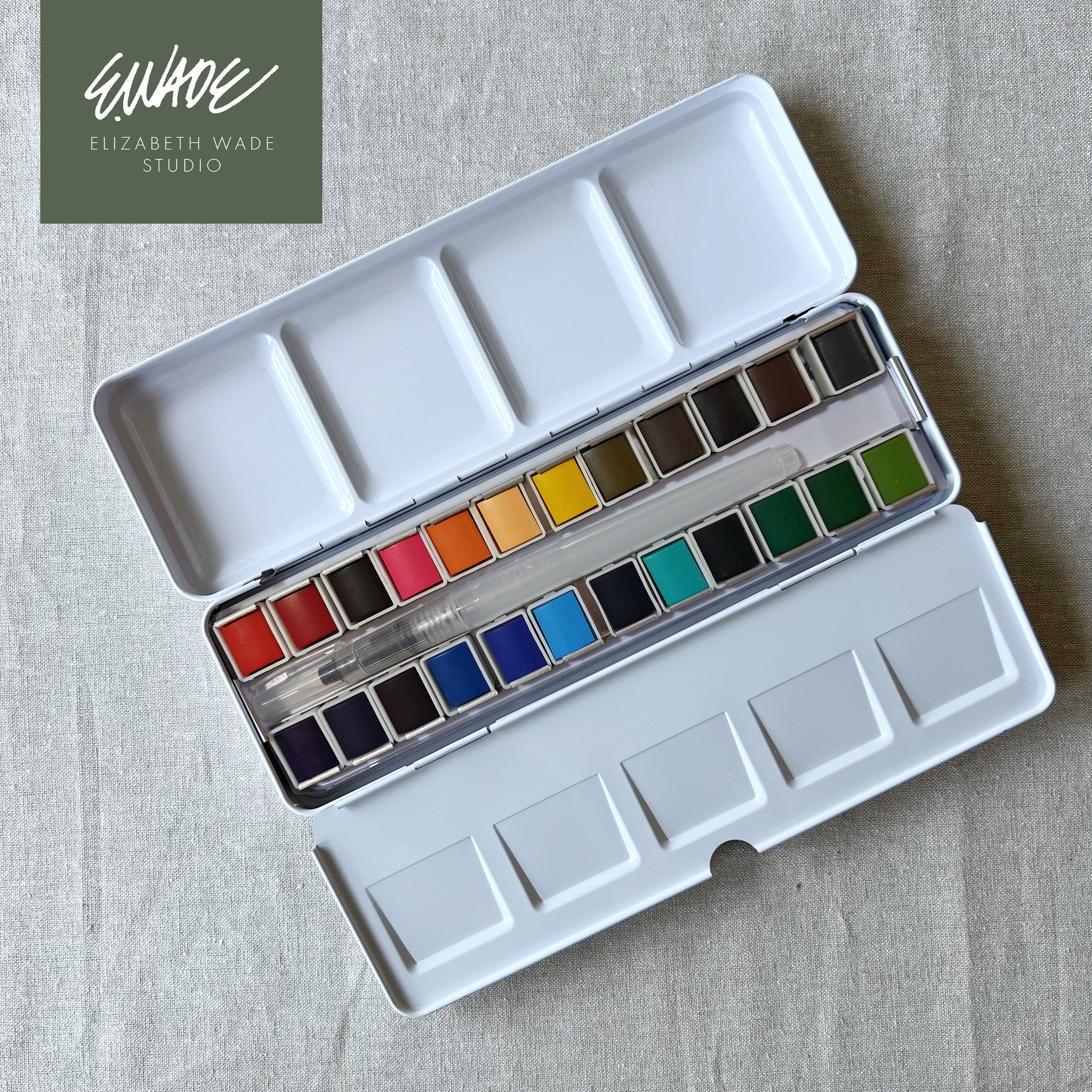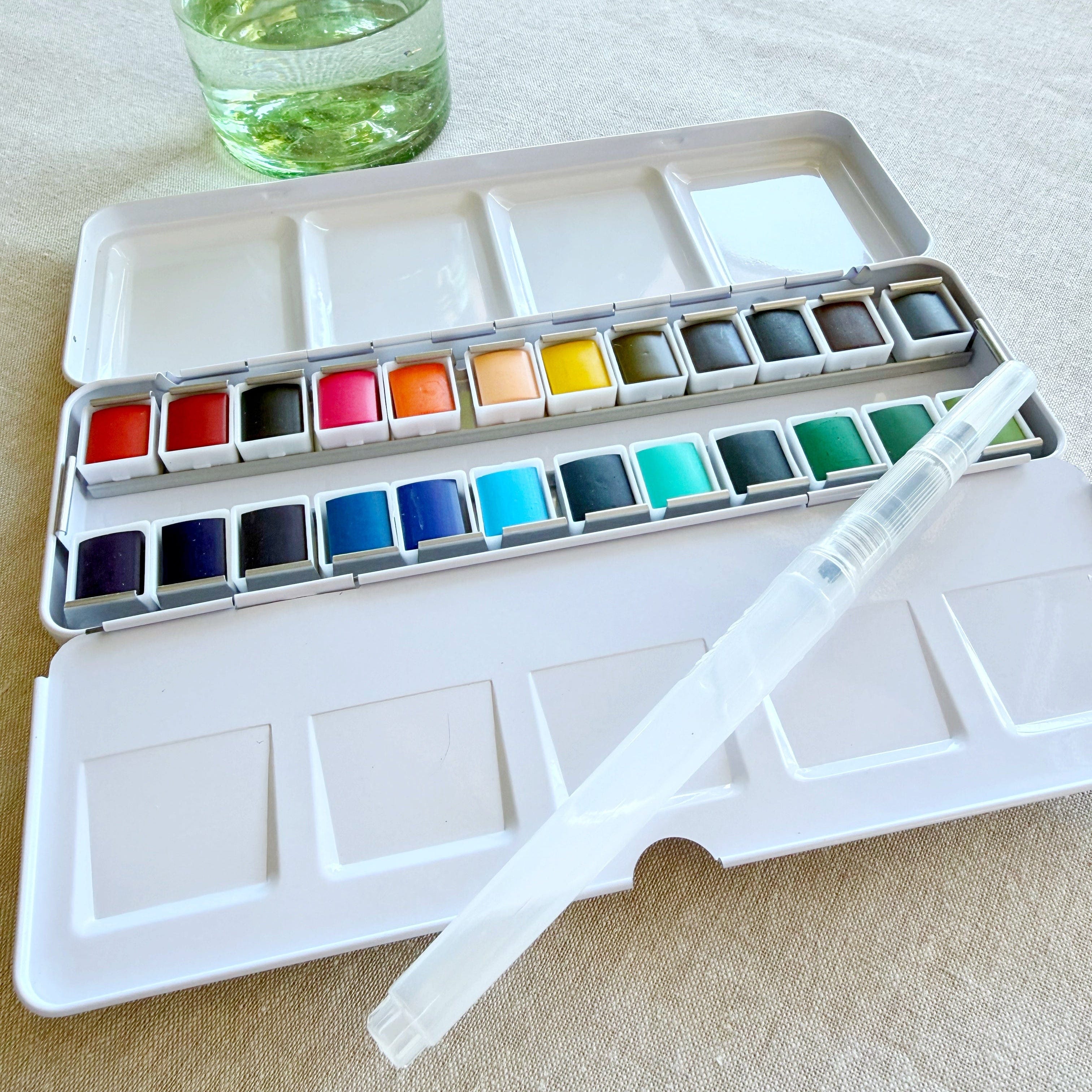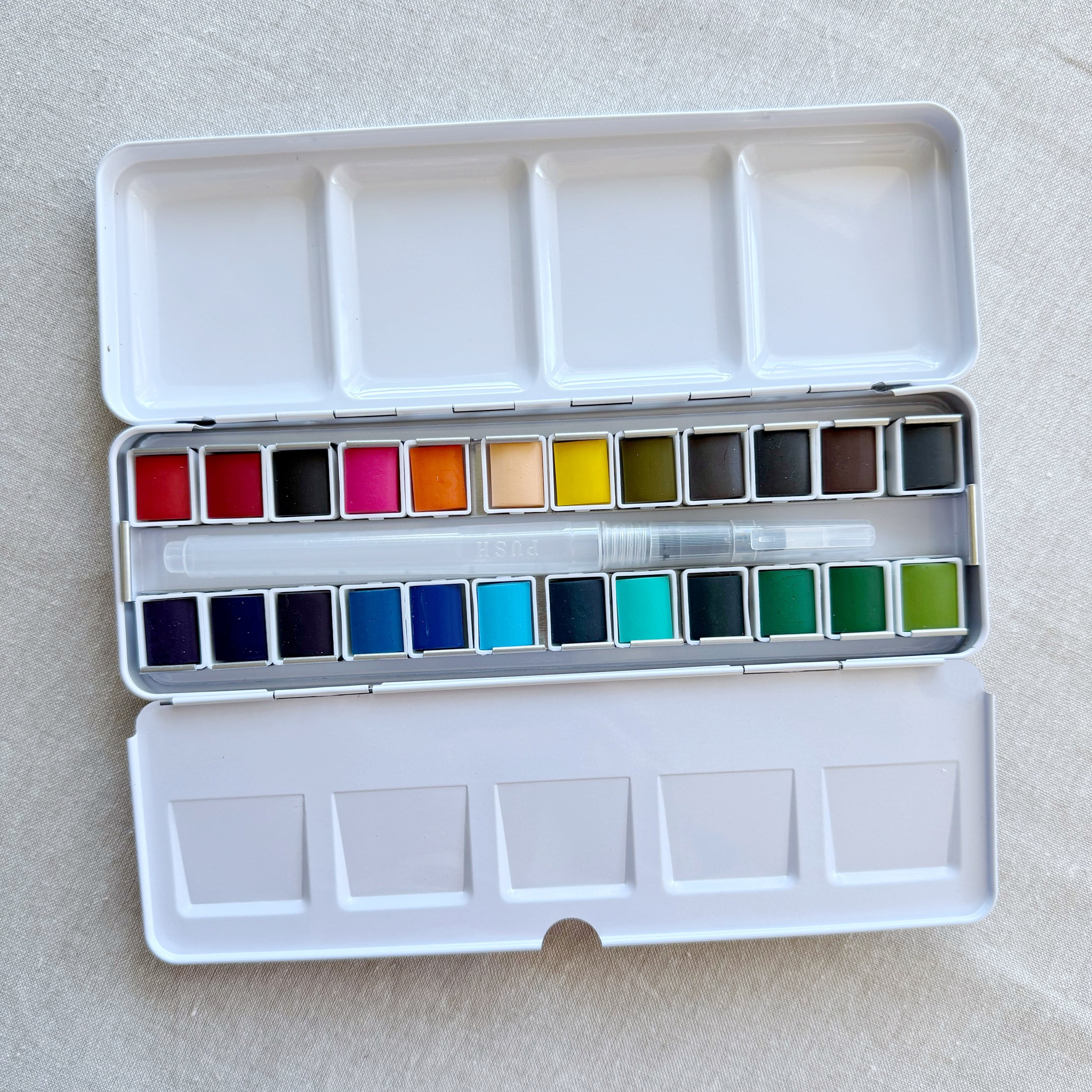 Twenty-four paint choices in a white covered metal tin with a cute design.